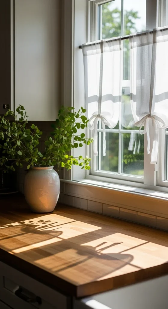 Café curtains work because they change the mood without locking you into a season. Light filters in. Privacy stays intact. Choose linen or cotton voile for movement and texture. Hang them halfway up the window so counters still glow during the day. Sheer fabrics create a lighter, brighter feel without blocking views.