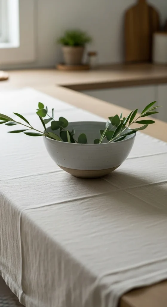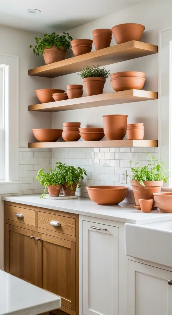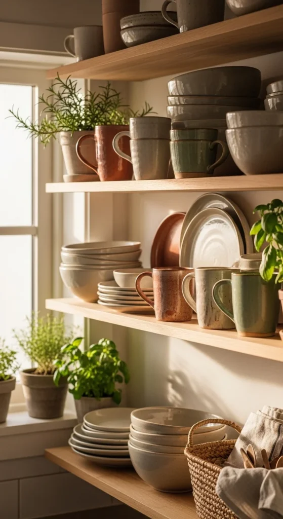 Ceramics don’t belong hidden away. Stack plates vertically. Line mugs by color family. Choose handmade or slightly imperfect pieces. Texture matters more than quantity.