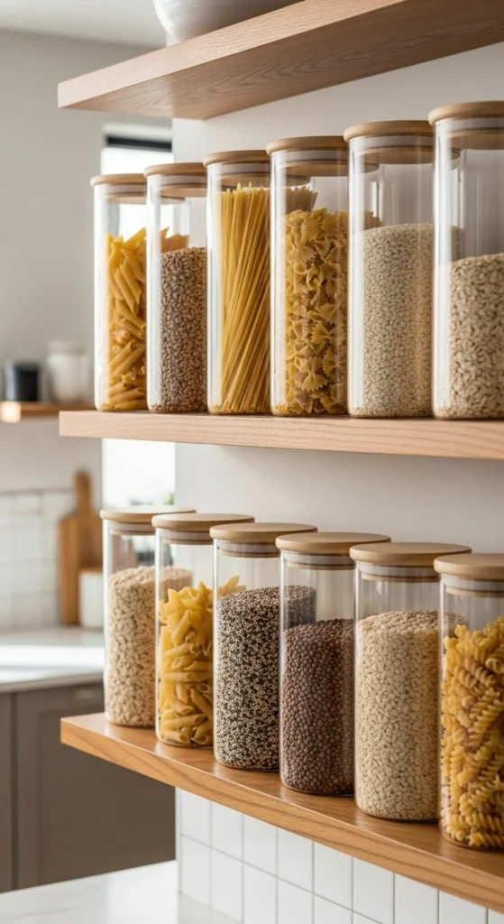 Uniform jars look calm. Labels can be minimal or skipped altogether.