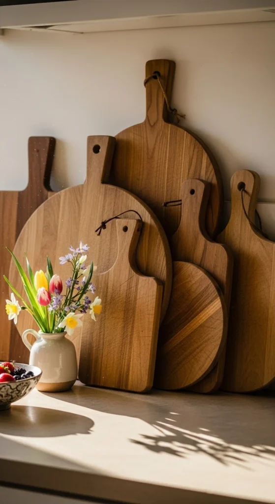 Boards add warmth vertically. Lean them instead of hanging to avoid extra holes. Mix shapes but keep wood tones similar. Worn surfaces feel relaxed and welcoming.