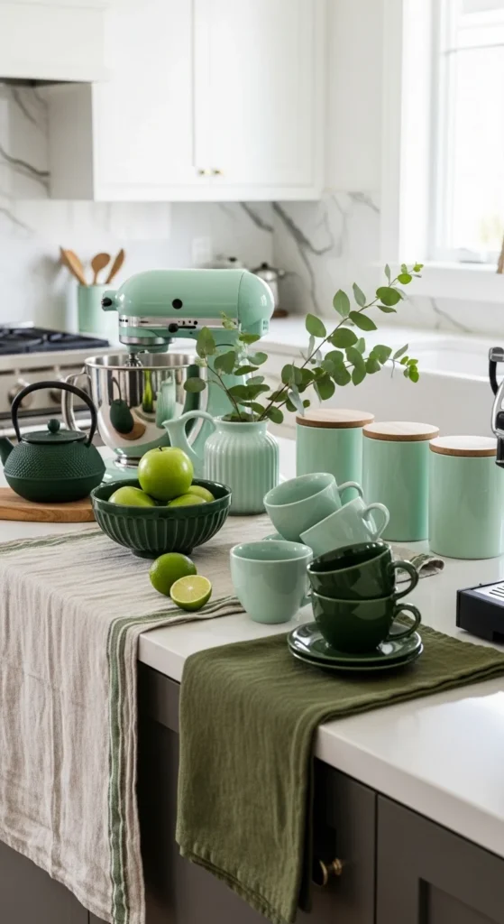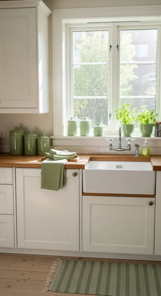 Green connects kitchens to nature. Sage, olive, or moss tones work well. Use sparingly. One color, repeated lightly.