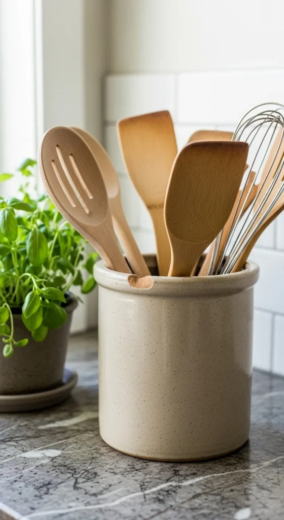 Old crocks add history and texture. Use them near the stove for tools you grab often. Functional decor reduces clutter.