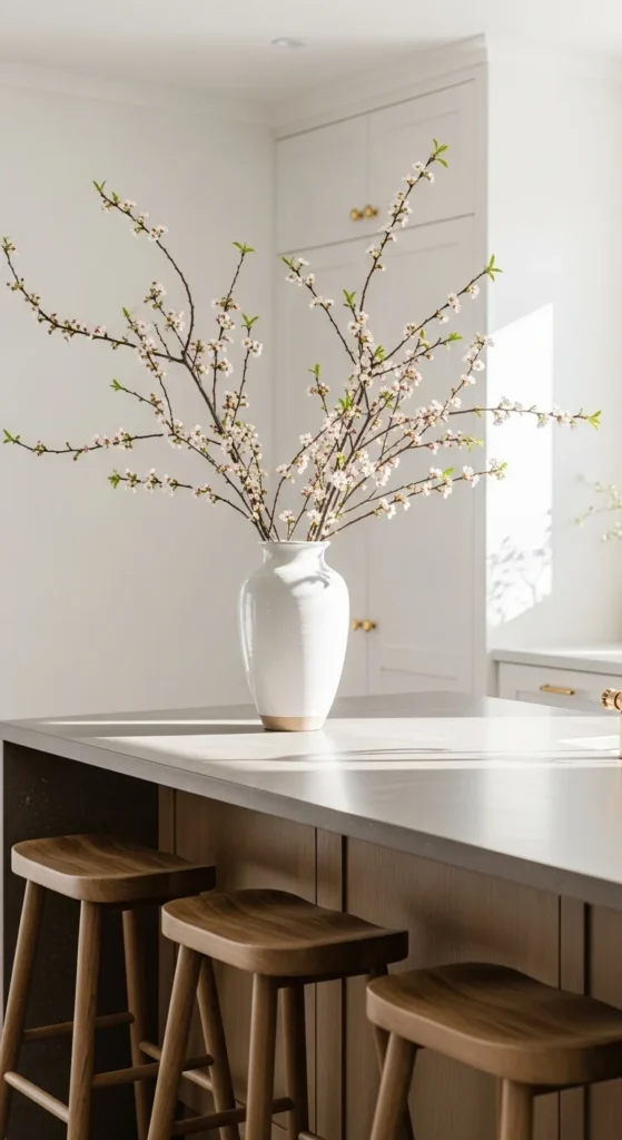 Branches feel intentional and architectural. They last longer than bouquets and fill vertical space. Cherry, quince, or faux dogwood all work. Keep the vase simple so the shape of the branches stands out. Think sculptural, not crowded.