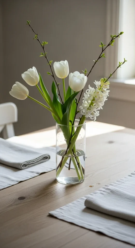 Keep arrangements loose and low. Fewer stems look intentional. Clear glass keeps things light. Less feels calmer.