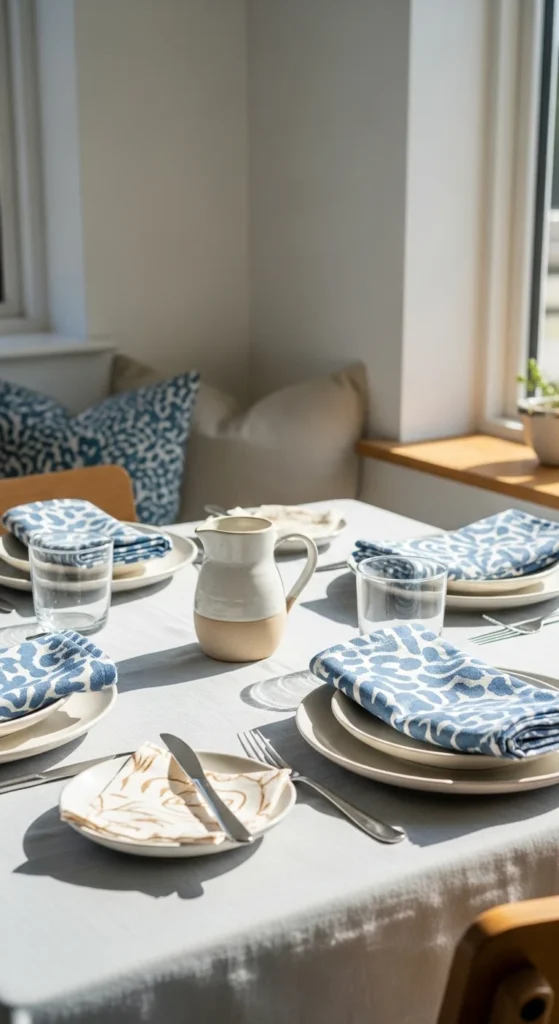 To keep it cohesive, repeat the napkin color somewhere else: a mug, a dish towel, or a small vase. If your kitchen is already busy, stick to one print and let everything else stay neutral. If it’s minimalist, add a second texture like rattan placemats to prevent the table from feeling flat.