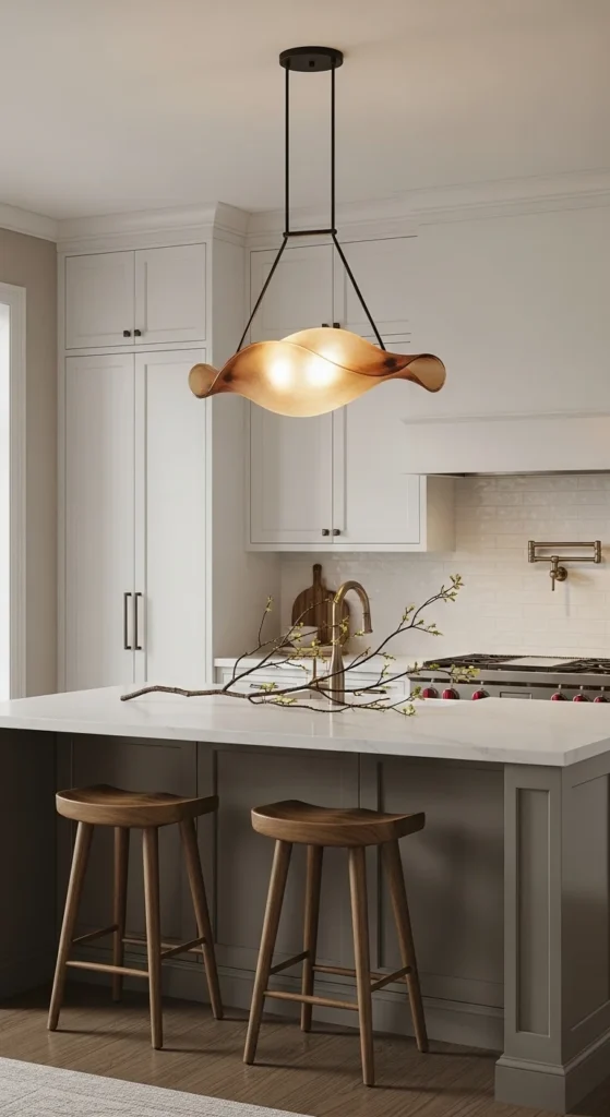 Keep the rest of the island styling simple so the pendant gets its moment—one tray, one vessel, one bowl. If your kitchen lacks windows, this becomes even more valuable. Think of it like candlelight for everyday life, just easier to manage.
