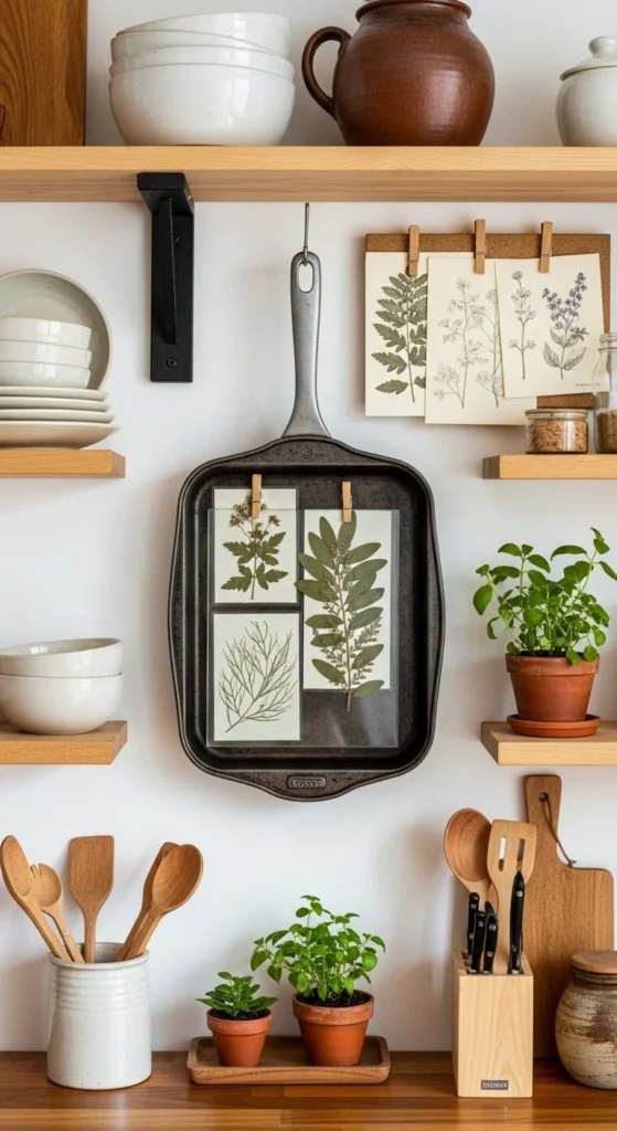 This is the sustainability-friendly idea most spring content skips. Old baking sheets, muffin tins, even scratched trays can become wall decor with personality. Clip small botanical prints, recipe cards, or pressed leaves inside the pan like a frame. Thrifted character pieces make a kitchen feel lived-in.