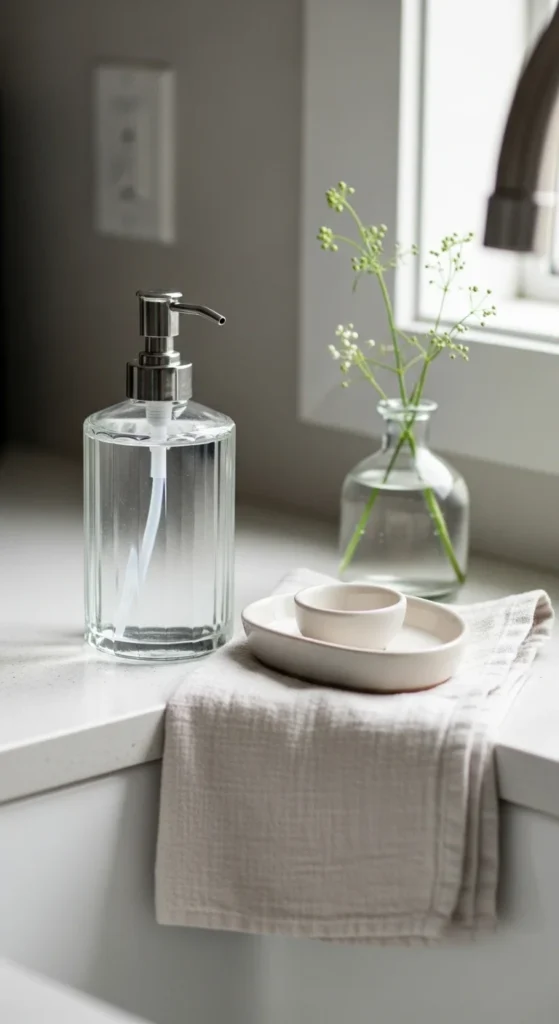 The sink area is a daily touchpoint, so small styling changes show up fast. Swap the plastic bottle for a glass dispenser and add a small dish for rings or sponges. Fold a light towel neatly and keep the palette simple. Little swaps, big visual payoff—especially here.