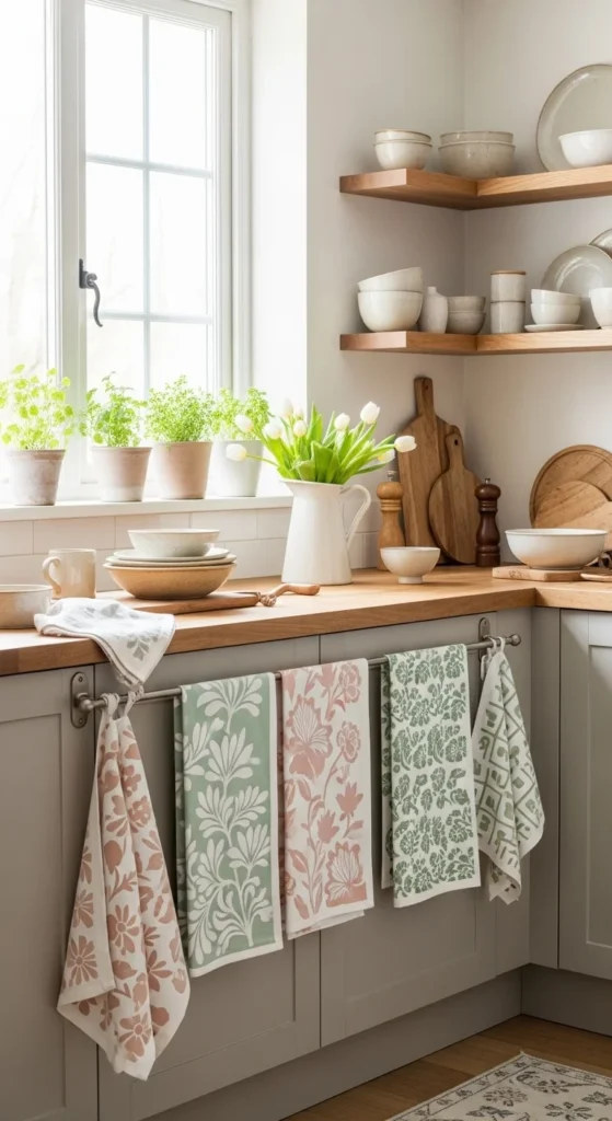 Tea towels are small but powerful. They introduce pattern and color without clutter. Block prints and thin stripes feel handmade rather than seasonal gimmicks. Drape them over oven handles or hang from hooks near the sink. This is a reversible swap that takes seconds.