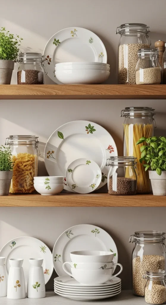 Instead of redecorating the whole kitchen, style one shelf. Group ceramics with botanical details alongside clear glass and wood. Leave negative space. Odd numbers look natural. A single vignette feels curated, not cluttered.