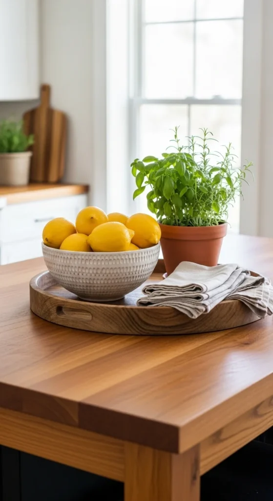 Trays organize decor so it doesn’t interfere with cooking. Keep it low and movable. Mix one living element, one functional item, and one textural piece. Islands act like furniture now.