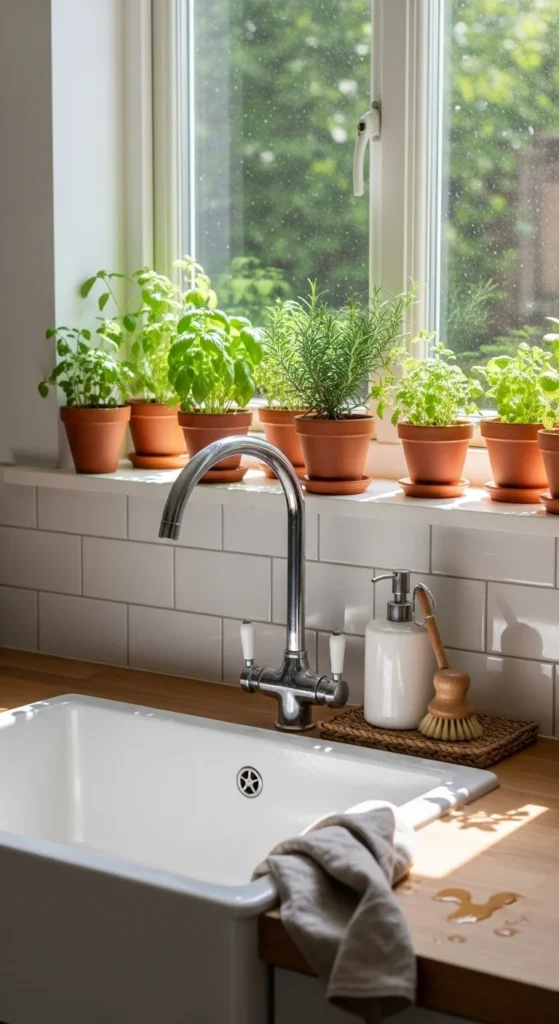Herbs add color and purpose. Basil, mint, and rosemary thrive near light. Group pots in odd numbers for balance. Terra-cotta brings warmth against white surfaces. Living elements change the atmosphere instantly.