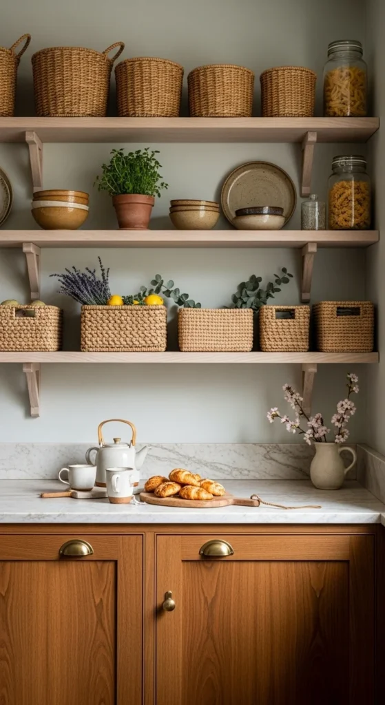 Baskets soften hard surfaces. Use them for produce, linens, or mail. Natural fibers balance stone and metal. Layered textures add quiet richness.