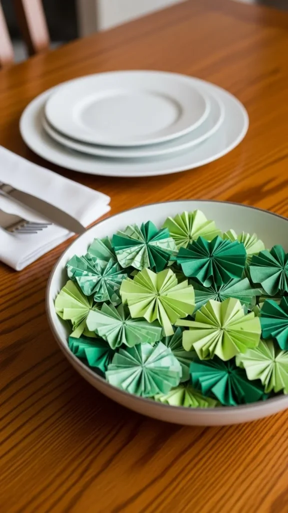 Paper elements add charm without cost. Fold clovers from scrap cardstock. Mix shades for depth. This centerpiece suits craft lovers and casual meals. Keep paper crisp and clean. Store clovers flat for reuse. It’s budget-smart and playful.