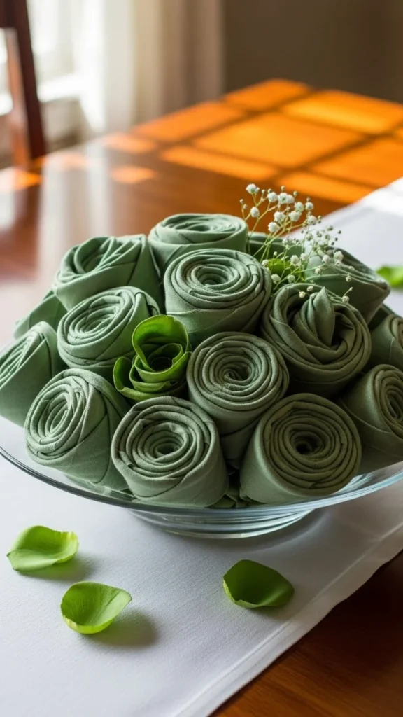Fabric napkins double as décor. Fold them into floral shapes for impact. Guests can use them later. This idea saves space and money. Stick to one color. The result feels clever and functional.