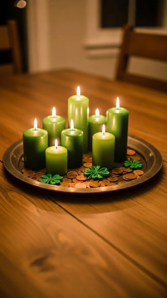 This centerpiece works because it relies on simple repetition instead of clutter. Three candles grouped together feel balanced and calm. Green glass holders tie directly into the holiday without shouting it. Faux clover strands add softness and movement across the table. Use battery candles if kids or pets are around. For a budget option, reuse clear jars and tint them with washable glass paint. Keep candle heights slightly different so the arrangement feels relaxed. A neutral table runner keeps the green tones from taking over. This setup suits dining tables, console tables, or buffet spreads. Swap clovers for eucalyptus after the holiday to reuse the pieces. Small gold accents, like brass trays or flat chargers, add warmth without stealing attention. Stick to one main shade of green to avoid visual chaos. This centerpiece works well for both daytime brunches and evening dinners. It feels festive yet calm, making it easy to style with everyday dishes.