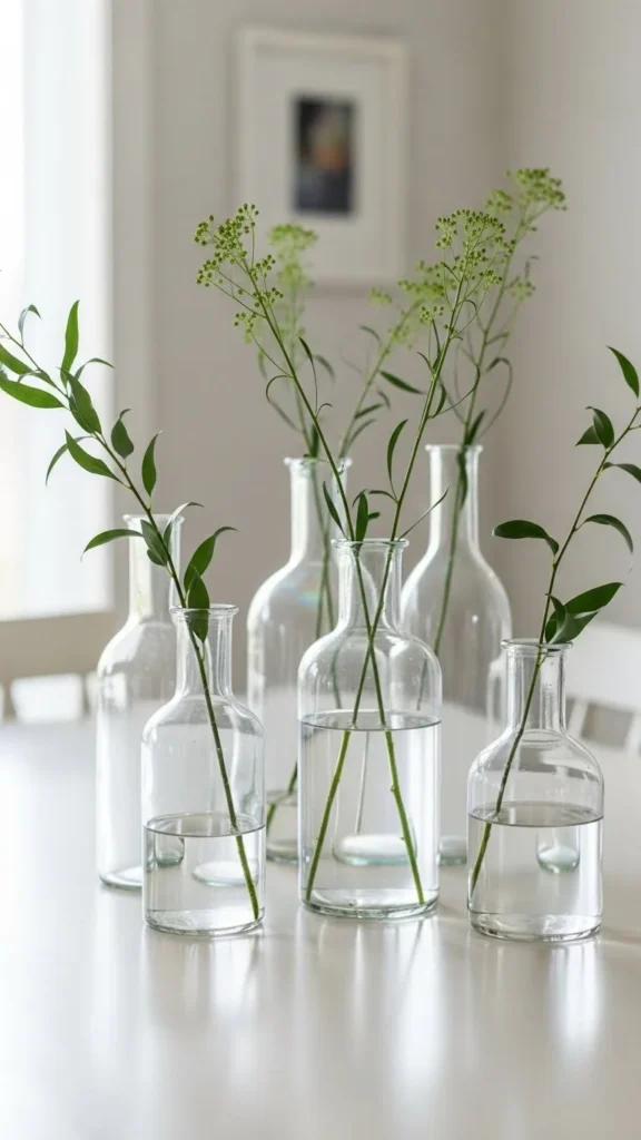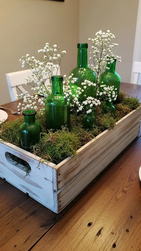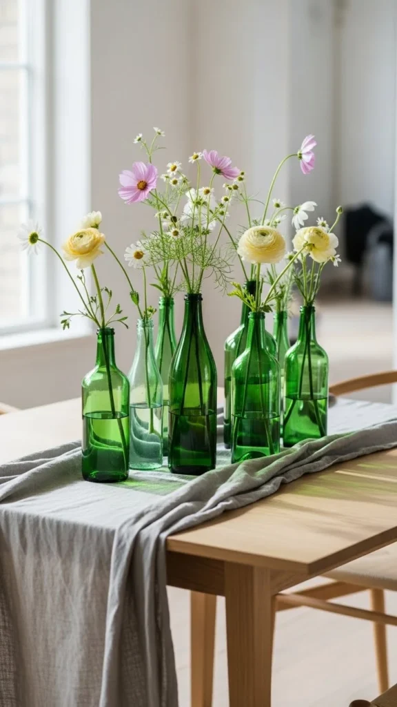 Collect bottles in different shapes for charm. Keep stems simple, like baby’s breath or faux sprigs. Odd-number groupings look more natural. This centerpiece spreads easily across long tables. It also allows guests to remove bottles if more space is needed. Clean labels off bottles for a polished finish. Use twine or thin ribbon sparingly if desired. This setup feels light and flexible. It works well with white dishes and wood tables. Store bottles after use and reuse them year-round. The look feels casual yet styled without feeling staged.