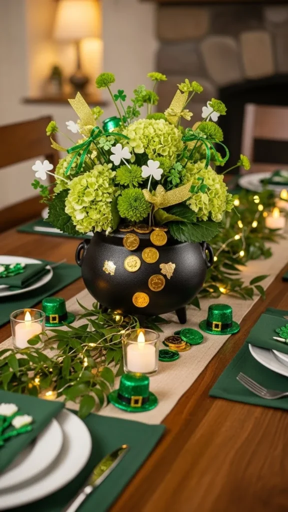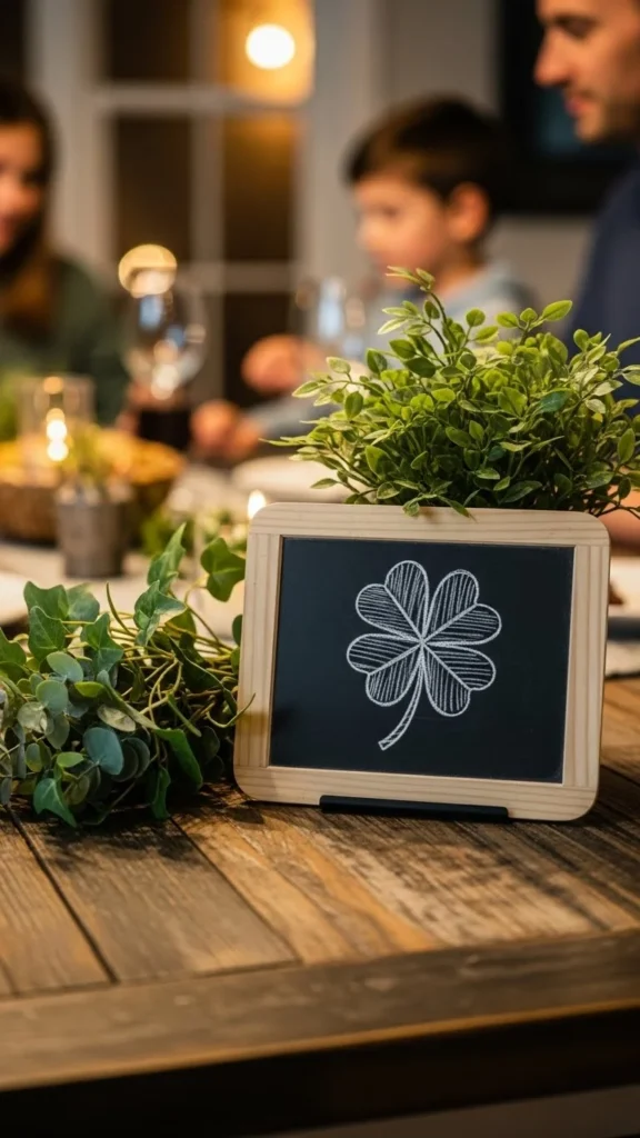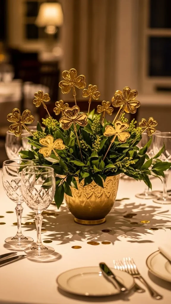 A potted shamrock creates a grounded centerpiece that lasts beyond one meal. Painting a basic planter gold gives it holiday character without extra décor. Use acrylic paint or metallic spray for quick results. Real plants bring life to the table and photograph beautifully. If live plants aren’t an option, use high-quality faux greenery with fabric leaves. Keep surrounding tableware neutral so the plant remains the focal point. This idea suits smaller tables where bulky centerpieces feel crowded. Place the pot on a simple tray to protect surfaces. Add a linen napkin beneath for texture. After the celebration, move the plant to a windowsill and keep enjoying it. This is a low-effort focal piece that still feels intentional. Avoid adding bows or signs so the look stays clean. One plant is enough. Let the green do the talking.