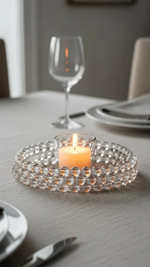 Garlands don’t have to be draped. Shape them into rings. Add a candle for focus. This keeps tables open. Use wooden or acrylic beads. The look feels neat and flexible.