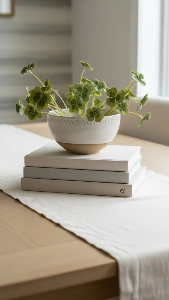 Stacked books bring height without bulk. Choose neutral covers so green details stand out. A small bowl of faux clovers keeps the theme clear but restrained. This works well on narrow tables where wide pieces feel crowded. Thrift stores are perfect for finding matching books on a budget. Wrap covers in kraft paper for a clean look. Keep the stack low enough to avoid blocking views. Add felt pads under the books to protect the table. This centerpiece feels layered and thoughtful without taking over the setting. After the holiday, swap clovers for beads or a candle. It’s an easy switch that keeps the base useful year-round. Stick to soft tones so the table setting still feels calm and welcoming.