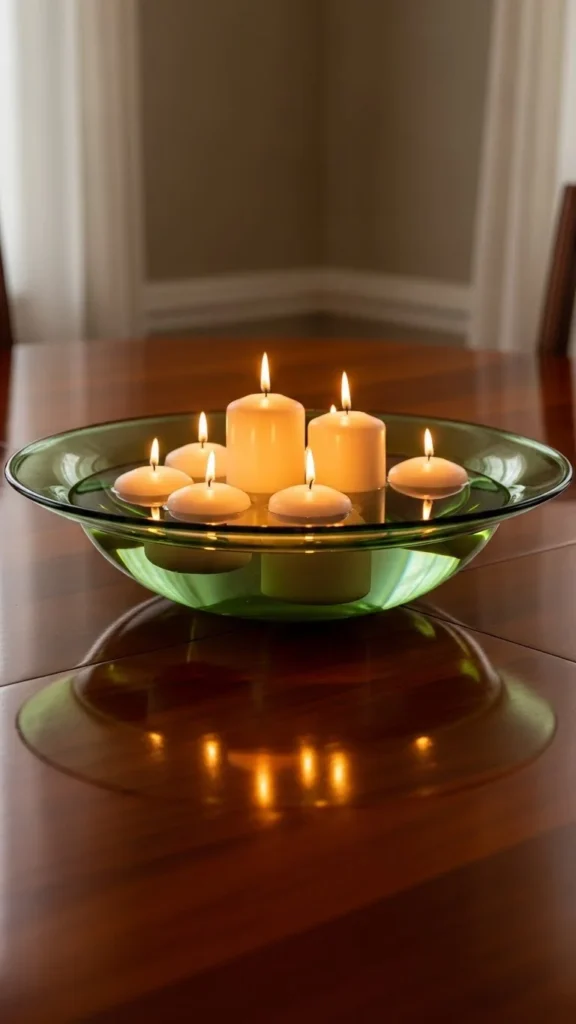 Floating candles create a mood with very little effort. A green glass bowl adds color without extra pieces. Use filtered water for clarity. Space candles evenly so the light feels balanced. This centerpiece suits evening dinners and quiet gatherings. Battery floating candles also work well and simplify cleanup. Keep the surrounding décor minimal to let the glow carry the scene. Place the bowl on a tray for surface protection. The result feels soft and inviting while staying simple. After the celebration, reuse the bowl with flowers or ornaments. This idea proves that one well-chosen element can set the tone for the entire table.