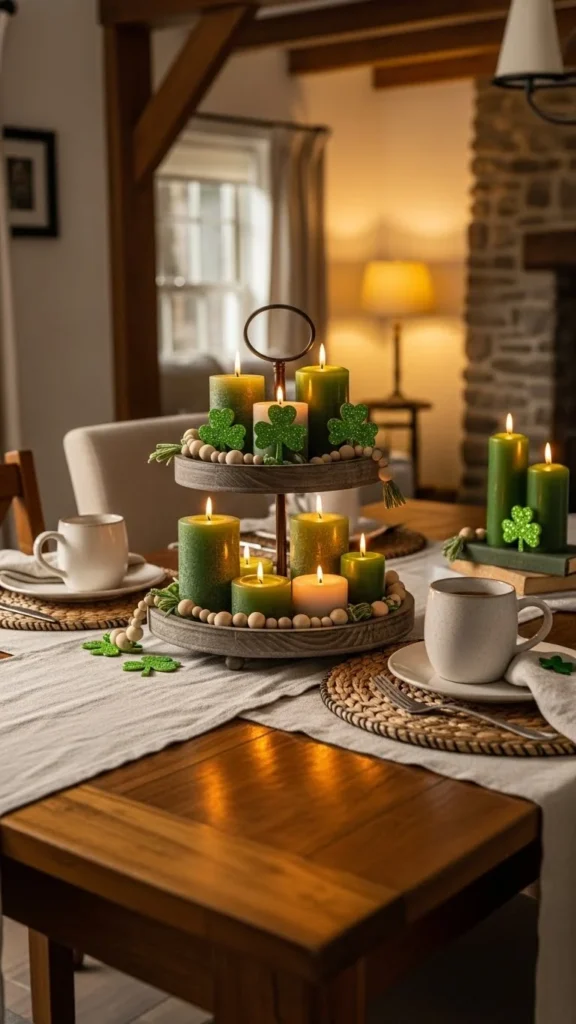 Tiered trays bring vertical interest while staying compact. Keep items small and evenly spaced. Use neutral fillers like beads or wood blocks to balance green accents. This works well for round tables. Choose battery candles for safety. Keep the tray low-profile. After the holiday, swap accents for everyday items. This setup feels organized and intentional.