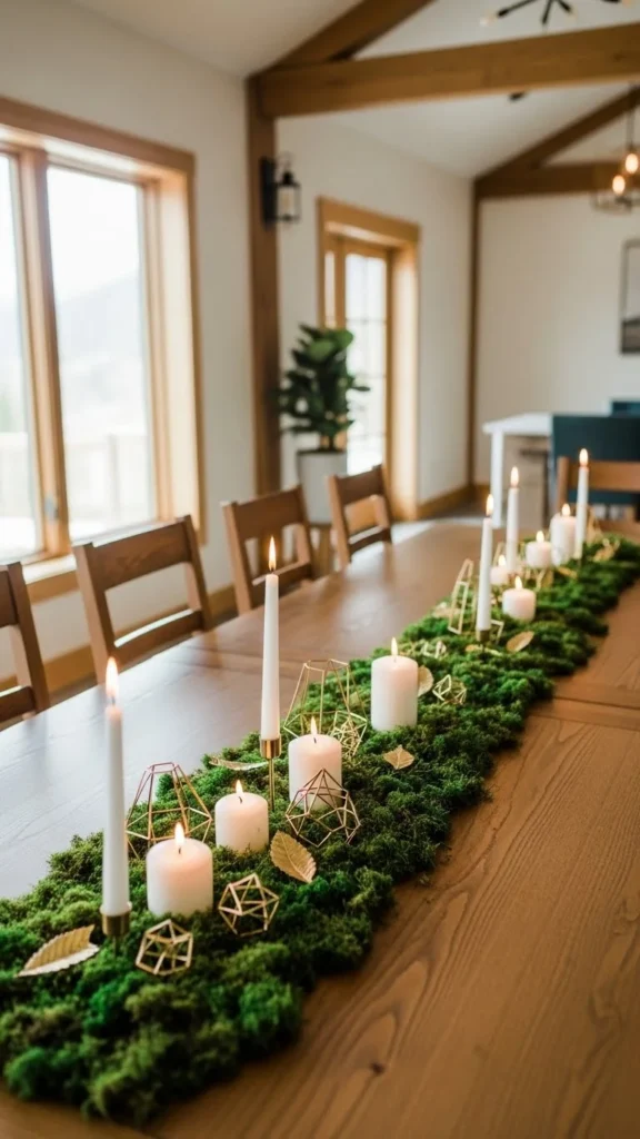 Moss runners replace bulky centerpieces entirely. Lay preserved moss along the table length. Add candles at intervals for rhythm. This idea suits long tables and communal meals. Use parchment under moss for easy cleanup. Keep candles spaced evenly. The look feels organic and relaxed. It photographs beautifully from above. A nature-forward approach keeps things calm.