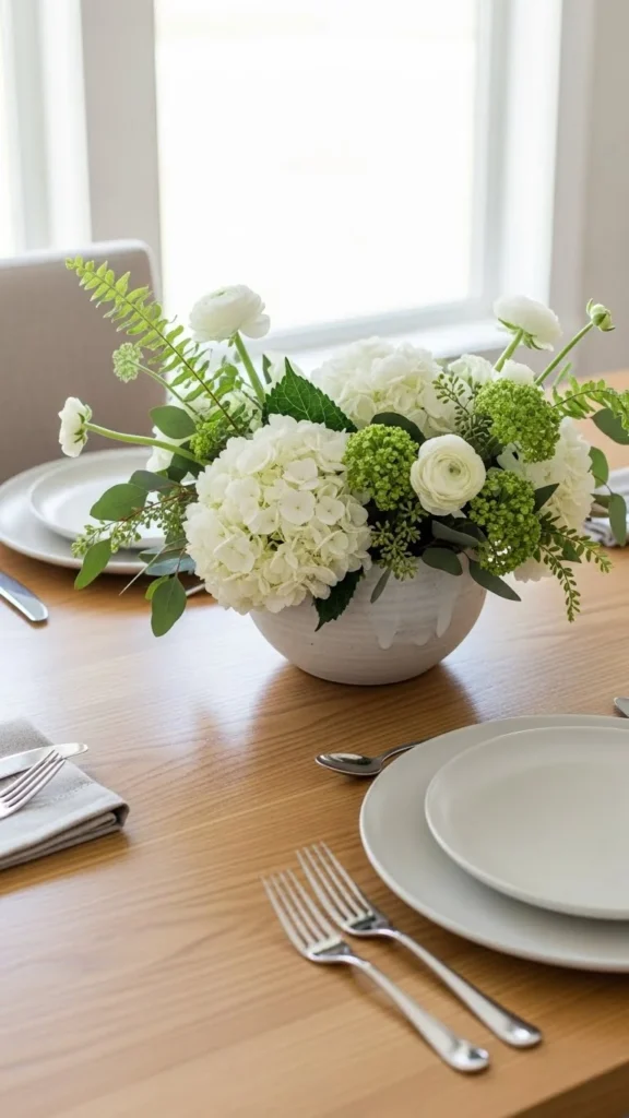 Low bowls keep tables usable. Choose blooms with varied textures. Keep colors limited to avoid noise. This arrangement suits formal dinners or brunches. Use floral foam or a pin frog. After the holiday, reuse the bowl year-round. The result feels clean and balanced.