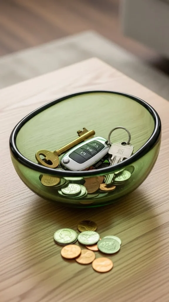 Glass keeps things light visually. Green tint adds color without heaviness. Limit contents to a few items. Everyday function meets decor here. Clear forms prevent clutter from feeling messy. Empty it often to keep it tidy.