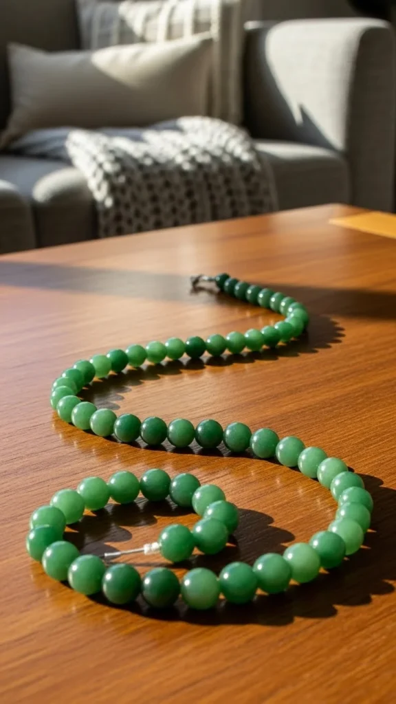 17. Green Stone Beads on the Table