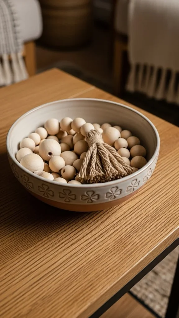 A small bowl anchors the table without clutter. Ceramic adds weight while wood keeps things casual. If you can’t find a clover bowl, use a plain white one and add green beads instead. Wooden beads are easy to make from craft store supplies and twine. Keep the bowl centered or slightly off-center. Avoid filling it too full. Negative space matters here. Natural textures help the piece blend with everyday decor. Handmade details add warmth without extra effort. After March, swap beads for shells or stones to extend the life of the piece.