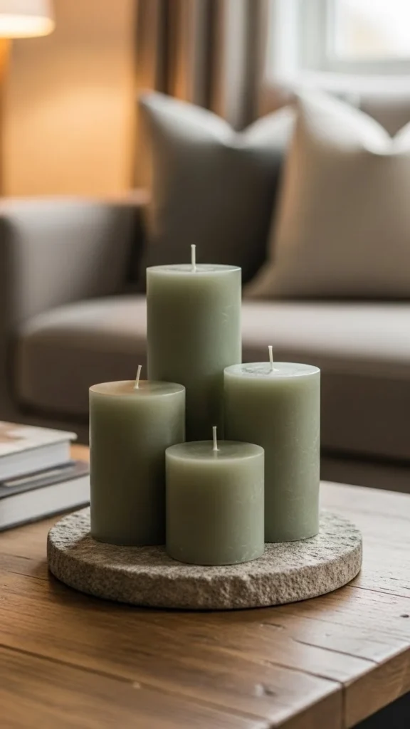 Felt coasters feel quiet and casual, which works well for a cozy coffee table. The soft texture contrasts nicely with wood and stone surfaces. Choose muted green rather than bright shades so the color stays gentle. You can cut your own from craft felt using a simple template. Keep the edges slightly imperfect for a relaxed look. Stack them loosely instead of perfectly aligned. That small detail keeps things from feeling staged. Soft textures help the table feel welcoming during everyday use. Low-effort styling makes this setup easy to keep in place even when the table is used often. When guests come over, the coasters are already within reach. After the season passes, swap in neutral felt and keep the same setup going.