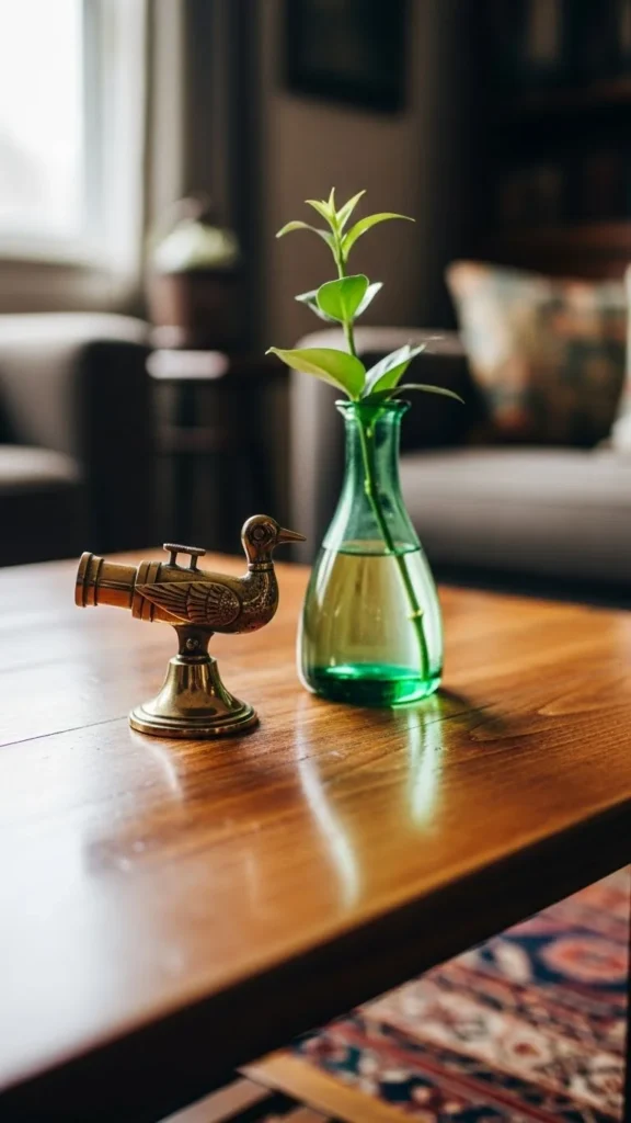 Brass and green always work well together. Look for small vintage pieces at flea markets. A green glass vase adds color without bulk. Use just one stem to keep it simple. Trim it short so it doesn’t block views. Warm metals soften cooler greens. Simple pairings keep the table functional. Rotate the brass piece later with books or candles to refresh the setup.
