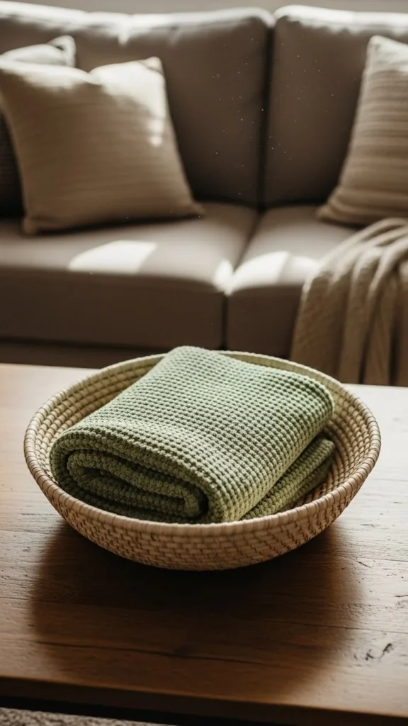 Baskets bring softness and storage. Choose a low basket so it doesn’t dominate the table. Fold the throw tightly for a clean look. Soft layers add comfort. Natural fibers keep the setup grounded. When guests arrive, the throw is ready to use.