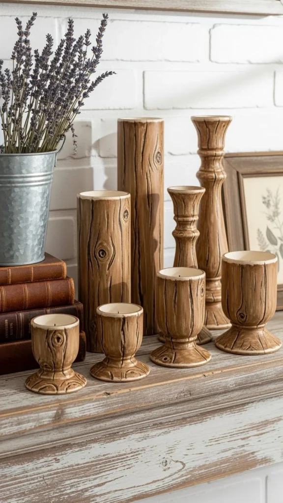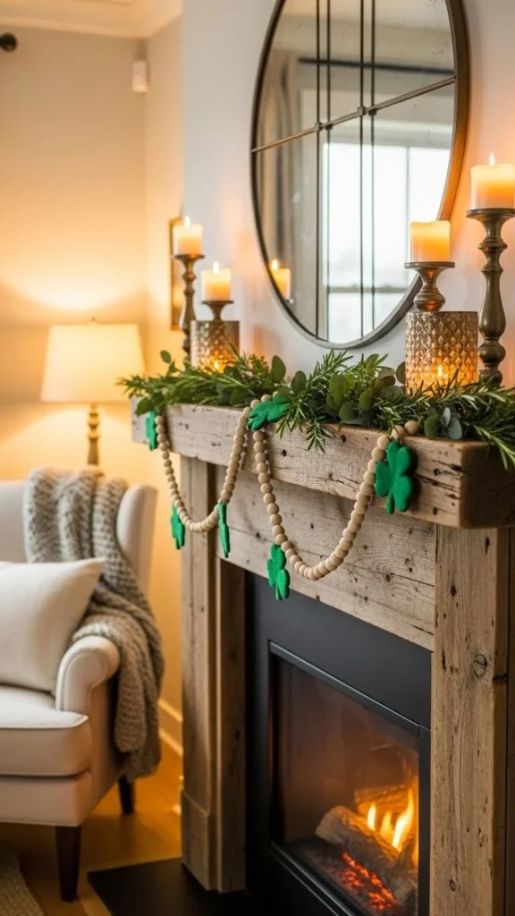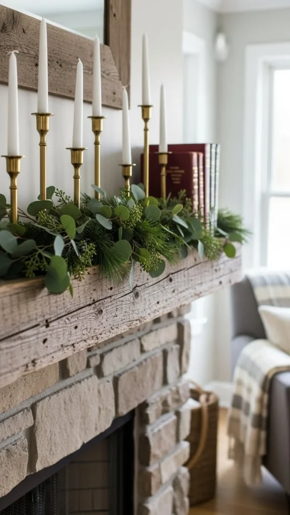 A weathered wood mantel sets the tone for timeless farmhouse character. Look for reclaimed beams or faux beams stained in muted browns. Keep green limited to garlands or moss accents so the wood grain stays visible. Add height with book stacks or framed botanicals. Thrifted brass candlesticks bring warmth without looking flashy. For renters, a mantel shelf mounted with anchors delivers the same look. Swap garlands seasonally so the base stays year-round.