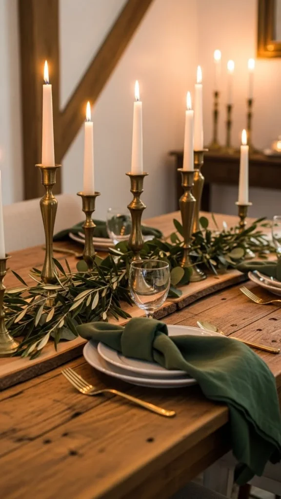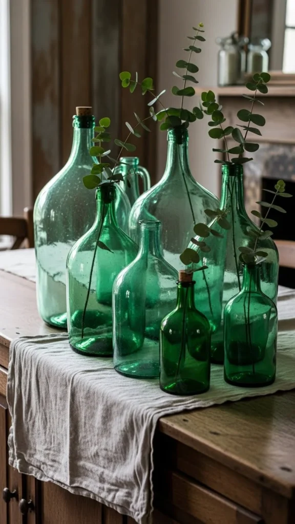 Green glass adds holiday color without screaming theme. Mix heights for interest. Keep labels aged or removed. These bottles transition beautifully into spring decor.