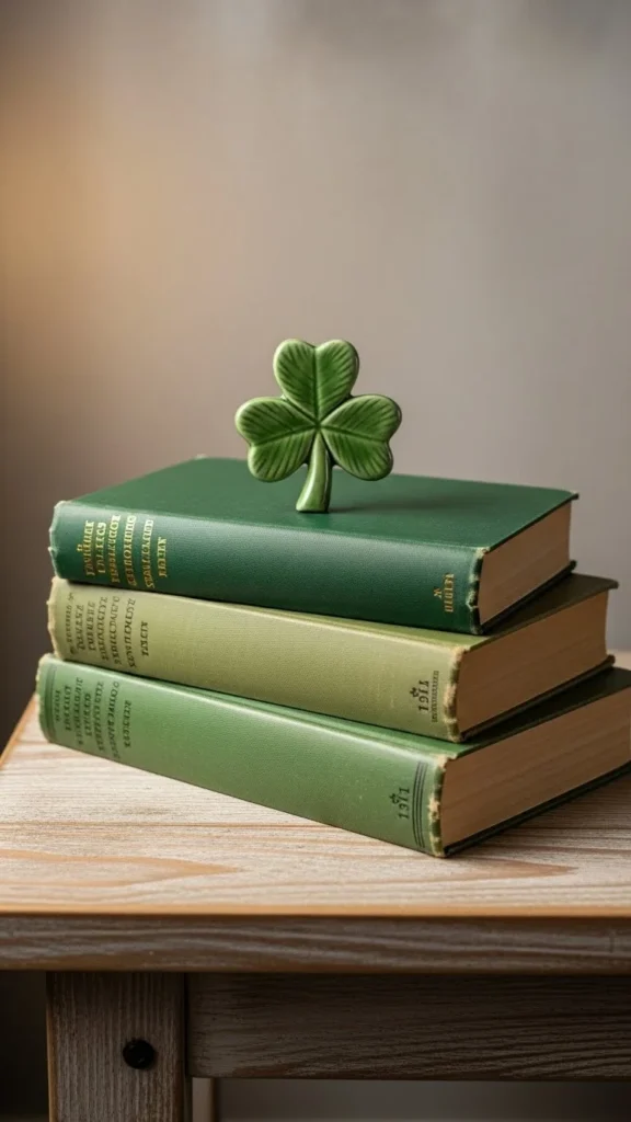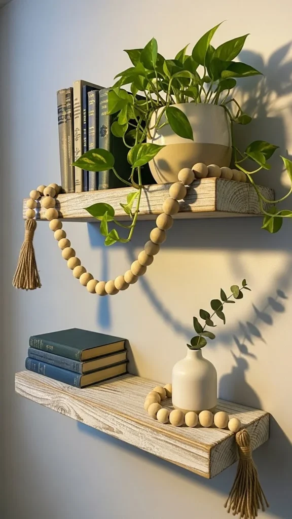 Shelves feel finished with a garland. Let beads fall naturally. Add one green tassel or shamrock charm only. Less detail keeps the shelf calm.