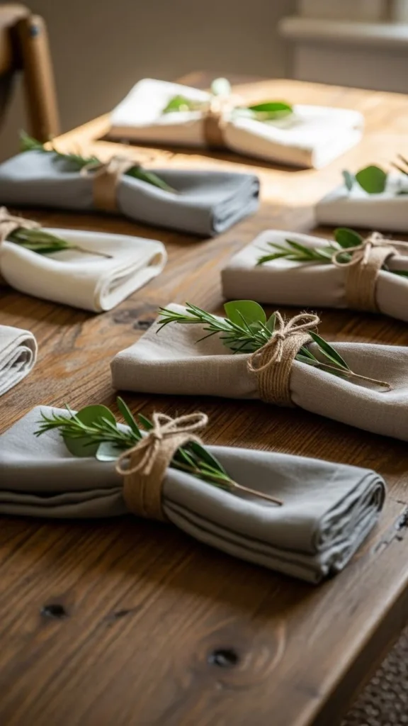 DIY napkin rings cost almost nothing. Wrap twine tightly. Add clipped greens just before guests arrive. Simple details matter.