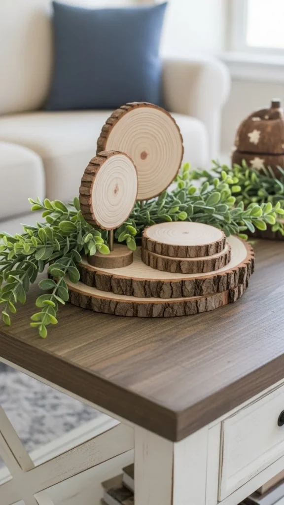 Wood slices replace plastic decor easily. Sand edges smooth. Seal lightly. Pair with greens for contrast.