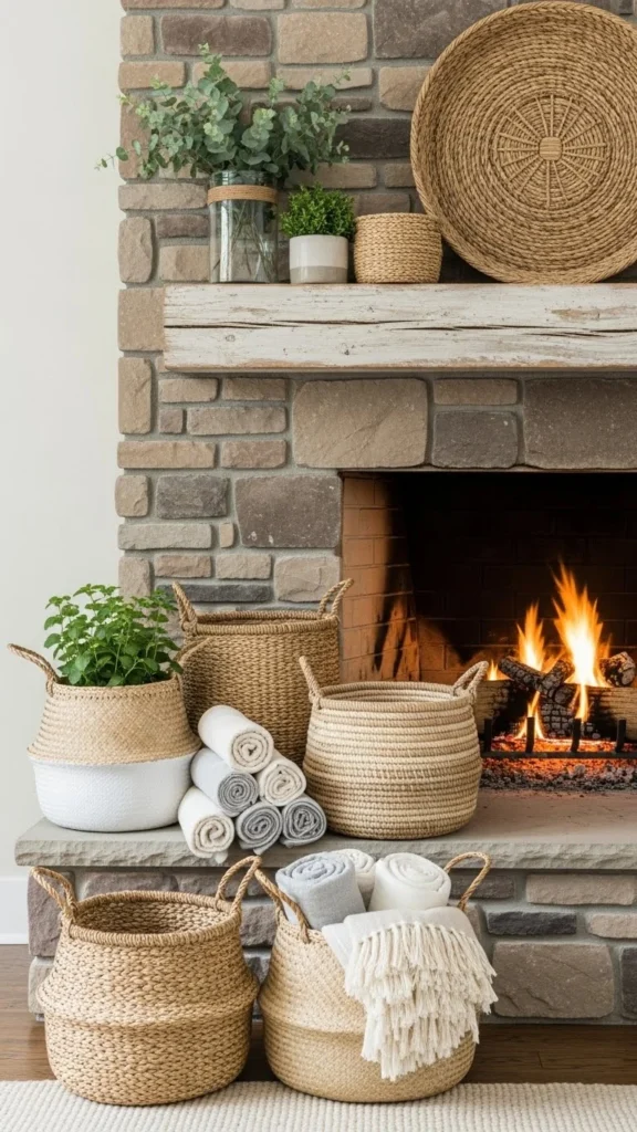 The hearth draws the eye. Keep decor low and soft. Baskets add structure without clutter.