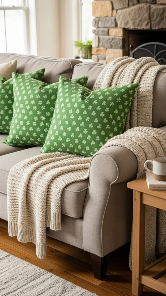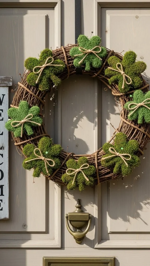 An interchangeable wreath saves space and effort. Start with a grapevine or finger-knit base. Attach shamrocks using floral wire or small hooks so nothing permanent is required. Keep embellishments lightweight. When the season passes, remove accents and store flat. The base stays ready for the next holiday without cluttering closets.