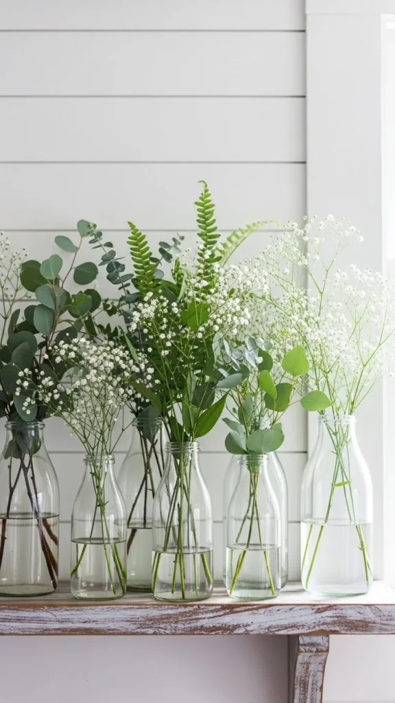 Milk bottles add height without bulk. Use ivy, eucalyptus, or faux stems trimmed unevenly. Group in threes. Clear glass keeps the look light while green stems add just enough seasonal color.