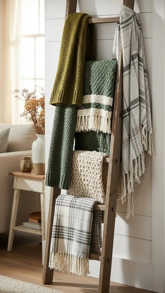 Decor ladders offer vertical interest. Drape one green throw among neutrals. Avoid heavy patterns. The ladder remains useful all year with seasonal textile swaps.