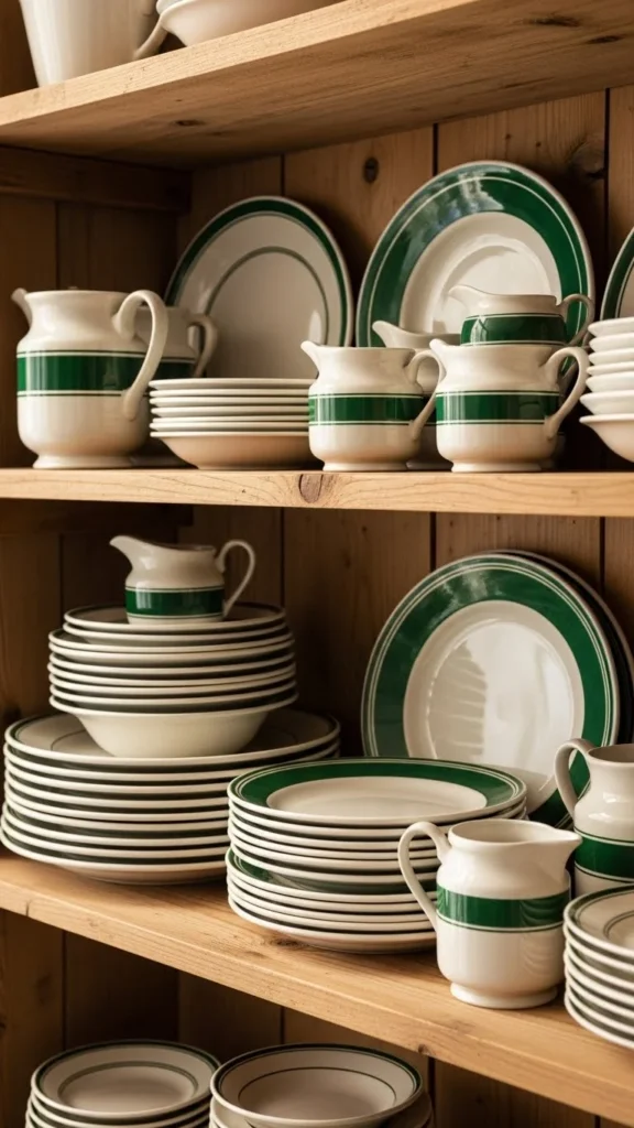 Vintage restaurantware feels collected, not themed. Look for subtle green bands or jade tones. Stack by size. Display sparingly so shelves don’t feel crowded.