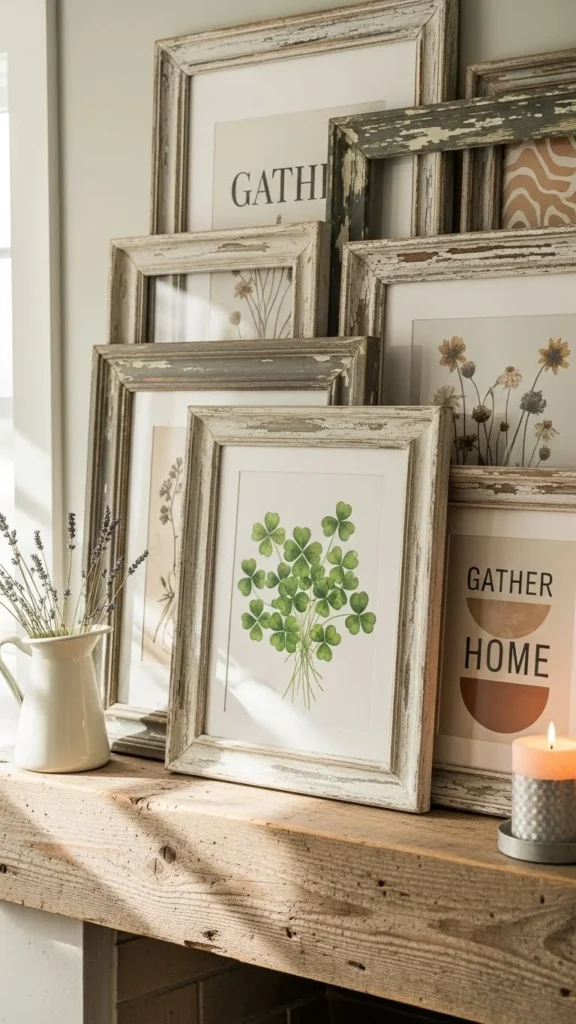 Layer frames instead of hanging everything. Mix sizes but keep finishes similar. Swap art prints easily using scrapbook paper or botanicals.