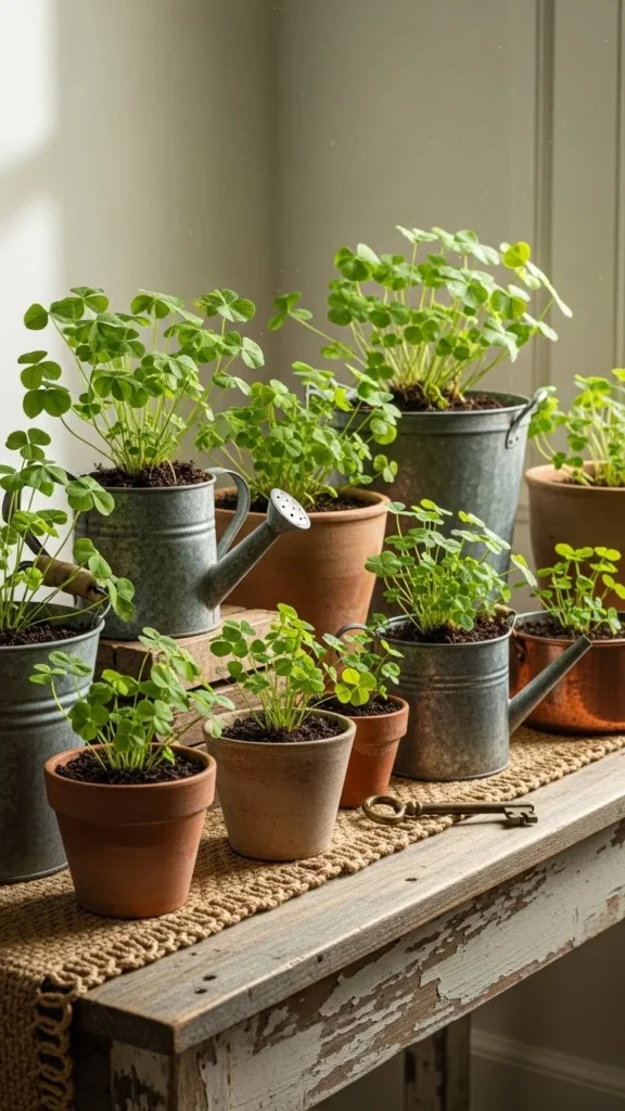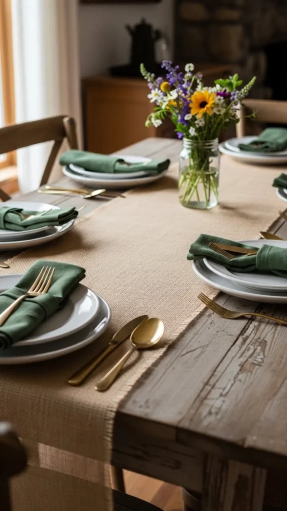 Burlap anchors farmhouse tables. Layer green napkins or clover sprigs on top. Keep patterns minimal. Texture does the work here, not color overload.