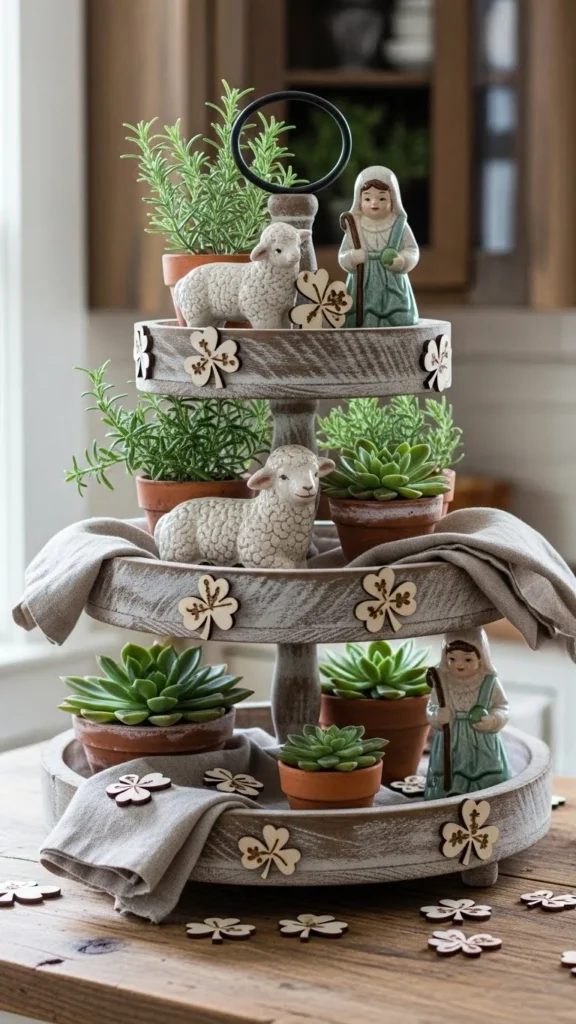 Tiered trays shine because they stay out all year. Swap only the top-layer accents. Wooden shapes, greenery, and small vintage finds work best. Avoid overcrowding. Leave breathing room so each piece stands out.