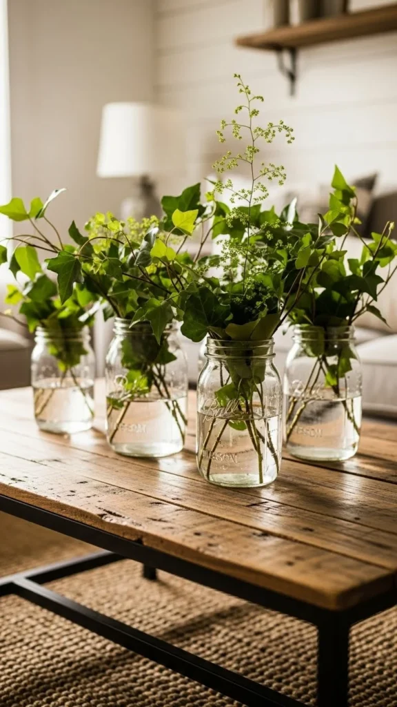 Mason jars never feel dated. Use mixed greens for depth. Wrap twine loosely for detail. Cluster in odd numbers for balance.