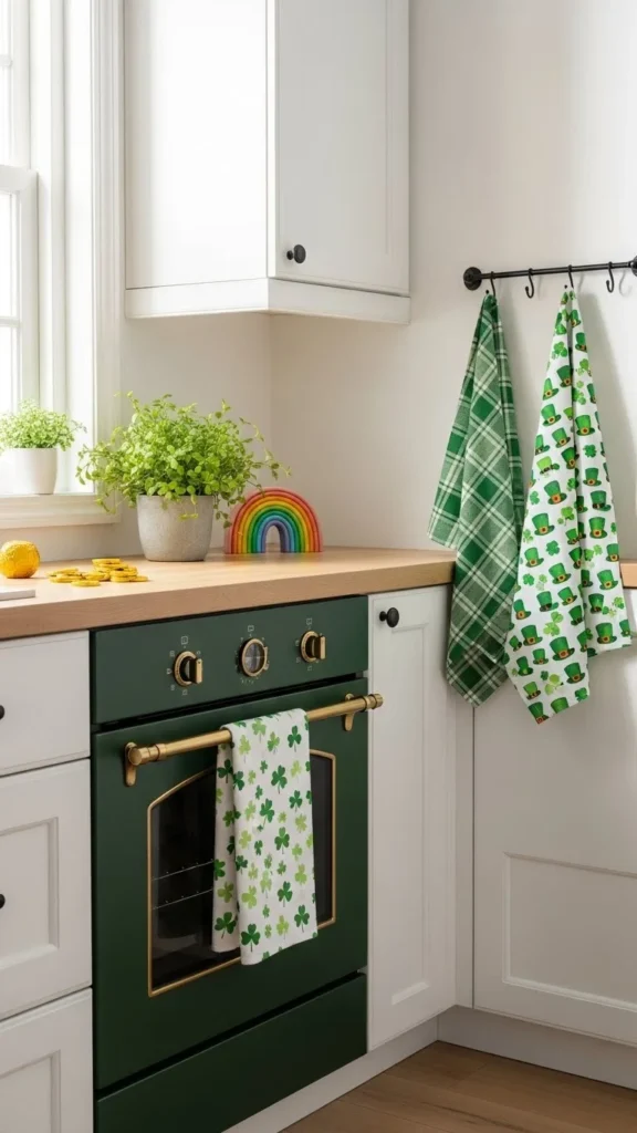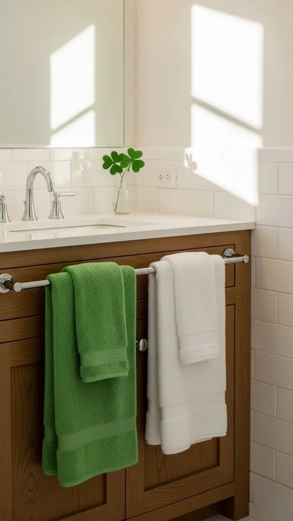 Bathrooms are perfect for quiet seasonal updates. Green hand towels instantly signal St Patrick’s Day without overwhelming the room. Choose cotton towels with subtle patterns or solid color. Neat folding changes everything here. Keep counters clear so the towels stand out. If buying new isn’t ideal, dye older white towels using fabric dye for a custom look. Avoid novelty prints that feel busy. Pair towels with a small plant or neutral soap dispenser. This setup feels calm, clean, and easy to undo once March passes. Swap towels back and you’re done. No storage headache, no extra clutter.