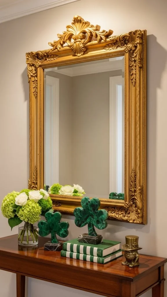 Mirrors reflect light and decor together. Gold frames pair naturally with green. Keep surrounding accessories minimal. Balance matters more than quantity.